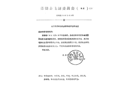 1982年 5月,苏州市编制委员会通过《关于同意建立苏州园林设计室的批复》(苏编发(82)23号),苏州园林设计室(苏州园林设计院的前身)成立。